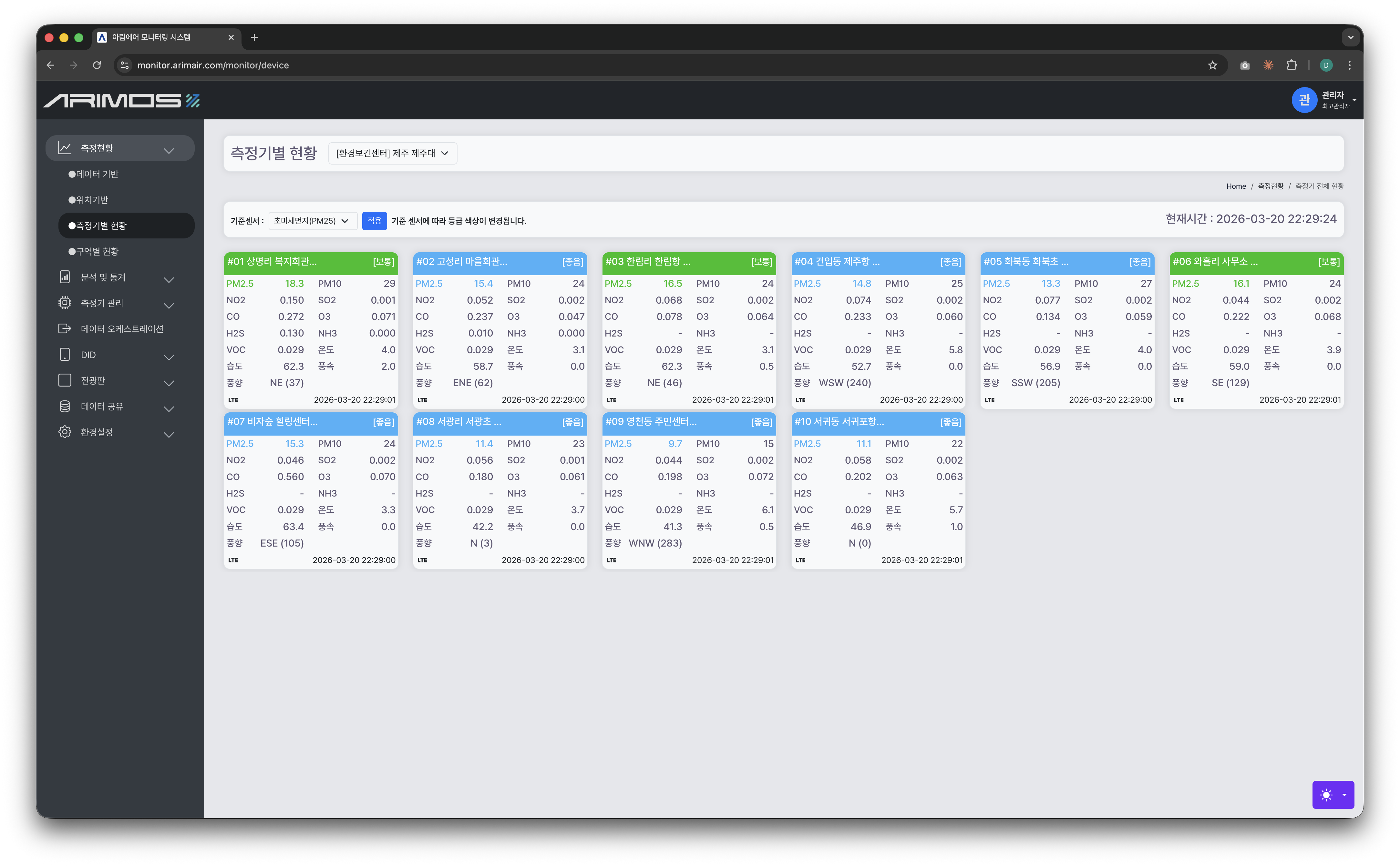ARIMOS는 전국 대기질 측정기를 실시간으로 통합 관리하고, AI 분석 기반 월간 리포트를 자동 생성하는 올인원 환경 모니터링 시스템입니다. PM2.5부터 VOC까지 10여 가지 항목을 24시간 수집·분석합니다.